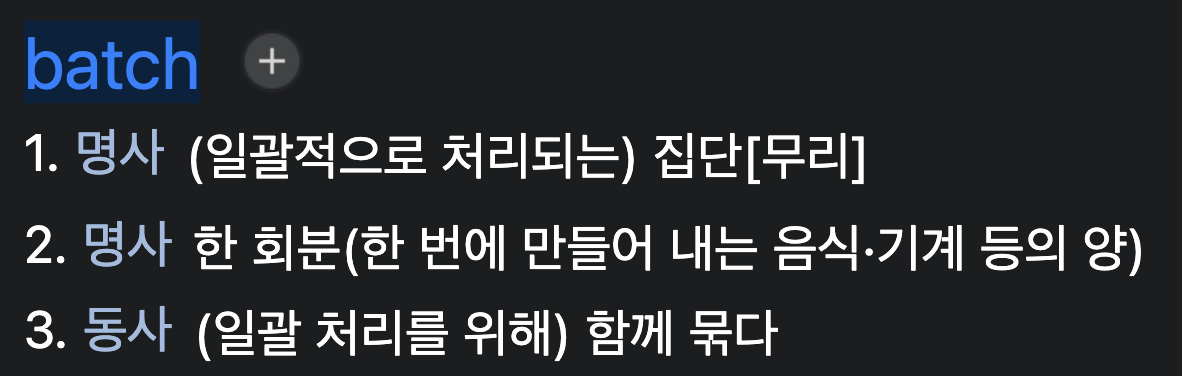 그리고 스터디의 주제인 batch 는 아래의 뜻을 가지고 있습니다.