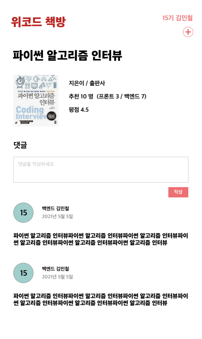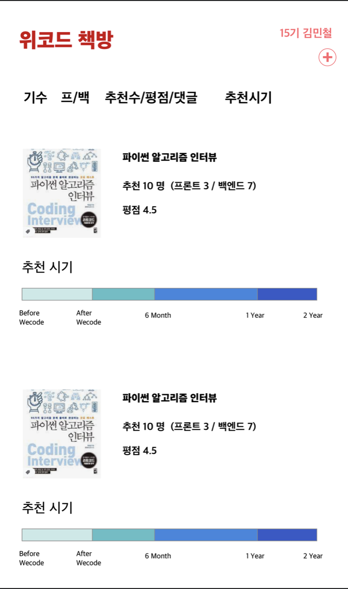 그래서 내가 나온 부트캠프 사람들끼리 읽은 책을 추천해 줄 수 있게 기획을 해봤다. 학교 다니면서 창업을 했었는데 그때 기획을 해본 게 도움이 됐다. Sketch와 zeplin을 써서 기획했다.