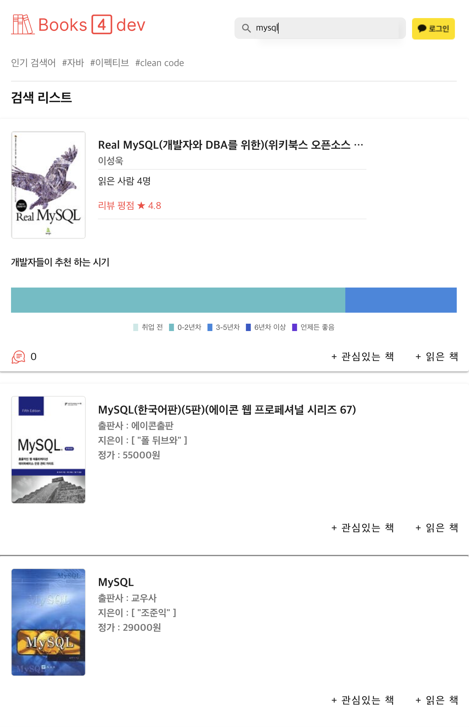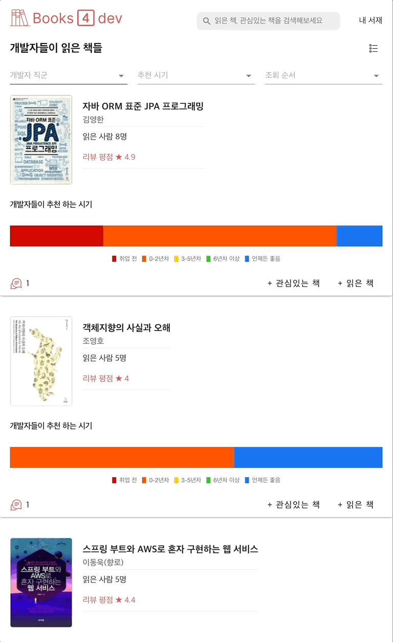 직군, 추천 시기 등으로 유저들이 읽은 책들을 확인할 수 있다