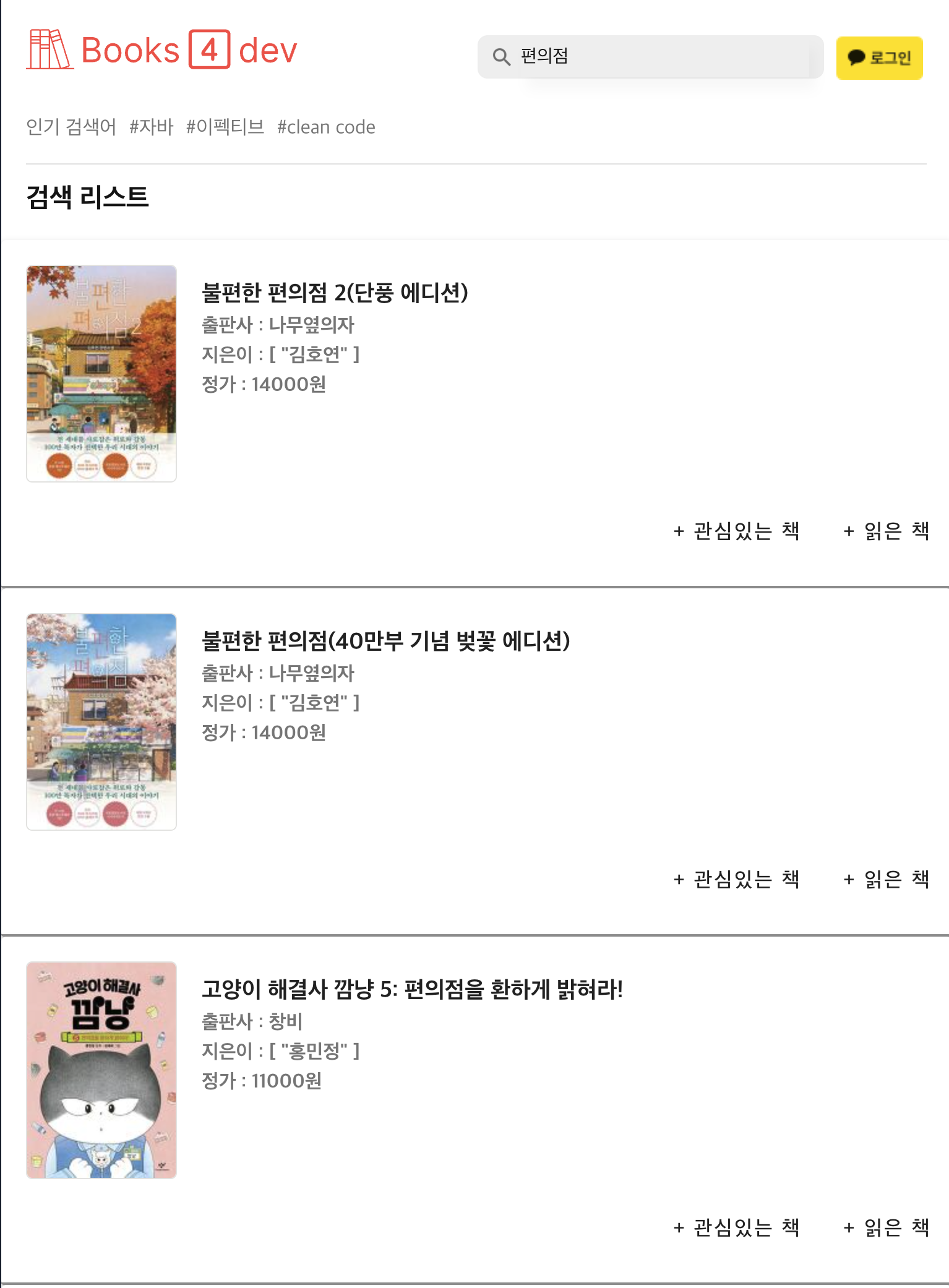 또 사이트에 오래 머물기 바라는 마음으로 인기 검색어와 책마다 연관 검색어를 넣었다. 한 두번이라도 더 눌러보길 바란다.