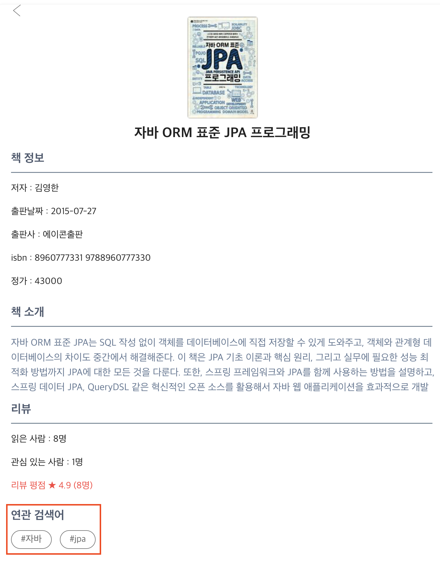 예전 검색에서는 카카오에서 받아온 데이터만 보여줬다. 내 서비스에 해당 책이 등록되 있더라도 위의 과거의 검색 화면처럼 별다른 정보를 표현해주지 못 했다.