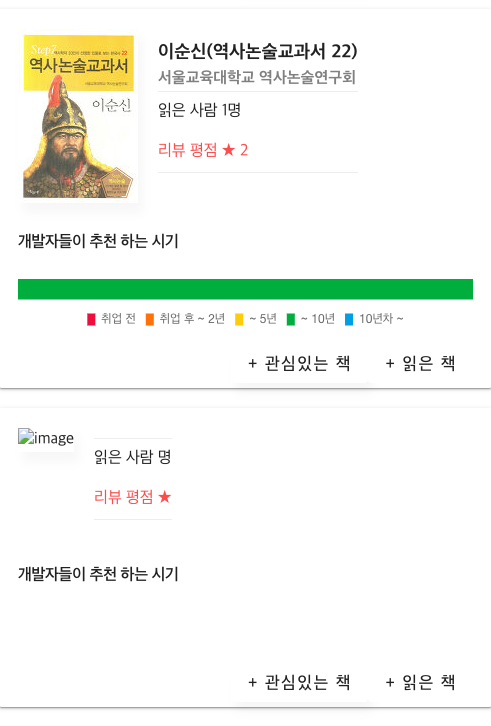 처음에 페이지네이션 구현할 때, No-Offset 방식인 무한 스크롤을 가장 먼저 시도했었다. 하지만 내 경우엔 책 마다 차트를 포함하고 있다. 차트는 <canvas> 태그를 이용해서 그려준다. 무한 스크롤로 새로운 데이터를 렌더링 해줄 때, 이미 차트를 그릴 Canvas 태그가 사용 중이어서 렌더링이 안되는 에러가 발생했다. 백엔드에서 보내준 데이터는 잘 전달이 됬지만, 차트가 그려지지 않았다. 아래 사진처럼 <이순신>까지가 첫 페이지 데이터고 엑박 뜬 부분이 무한 스크롤로 불러온, 쉽게 말하면 2페이지 데이터다. 차트가 안 뜨면서 다른 데이터들도 화면에 제대로 나타나지 않았다. 여러 블로그를 참고해가며 수정하려 했지만 결국 차트를 그리지 못 했다.